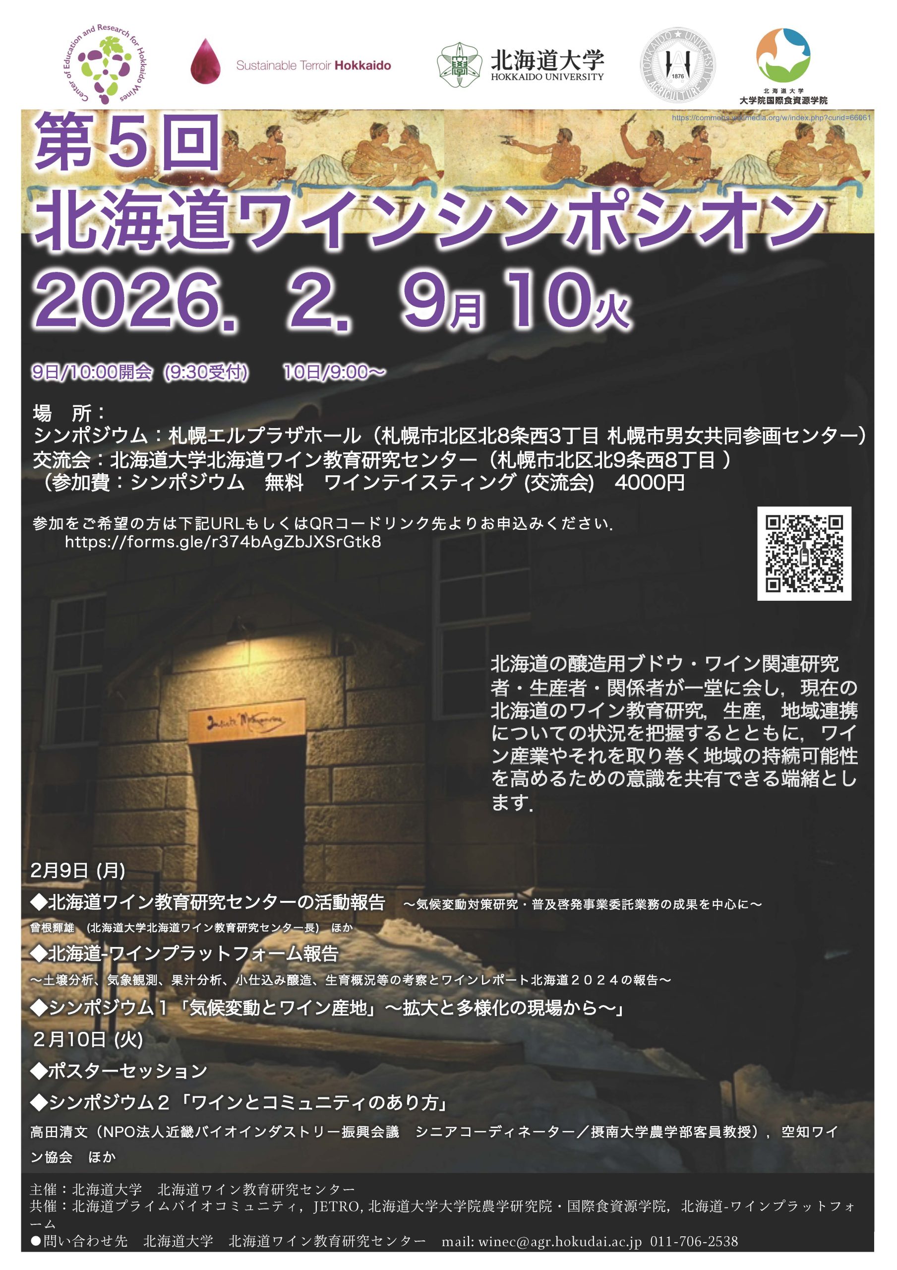 北海道大学北海道ワイン教育研究センターは、北海道のブドウやワイン関係者が一堂に会し、現在のワイン研究や生産、地域連携の状況を把握するとともに、ワイン産業やそれを取り巻く地域の持続性を高めるための意識を共有できる場として北海道ワインシンポシオンを開催しますので以下のとおりお知らせいたします。